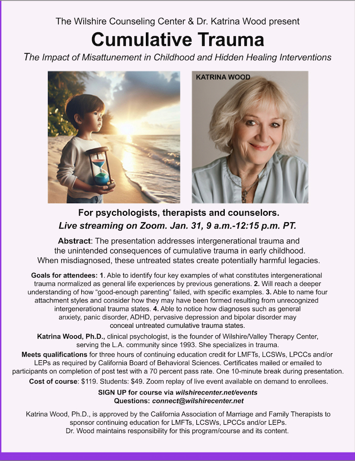 The Wilshire Counseling Center and Dr. Katrina Wood present the live-streaming presentation “Cumulative Trauma: The Impact of Misattunement in Childhood and Hidden Healing Interventions.”